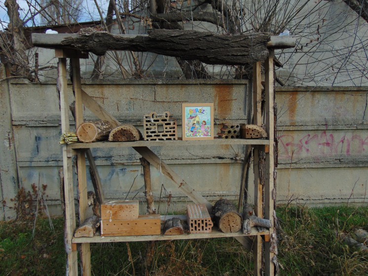 A kertben télen csendes rész a Rovar Hotel, amelyben már kifúrt fahasábok, téglák és nádszálak is várják a tavaszi rovarvendégeket. Új szerzeményünk egy látvány Darázsgarázs, ami reményeink szerint tavasszal majd benépesül.