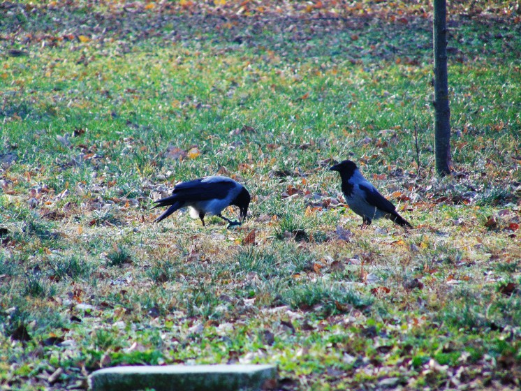 Bár az ügyes és erős varjak egyelőre nem tudtak kárt tenni a másik etetőben, azért ott is „garázdálkodnak”. A szemem láttára sikerült lelopniuk egy cinkegolyót, amit pedig dróttal erősítettünk fel. A lelkes dolmányos varjú leszállt a zsákmánnyal a földre, s méretes csőrével pillanatok alatt darabokra vágta azt. Nem volt szerencséje, mert én közeledtem, erre elrepült, én pedig biztonságba helyeztem a megviselt madáreledelt: betettem a rácsok mögé, ahová csak a cinkék és a verebek férnek be.