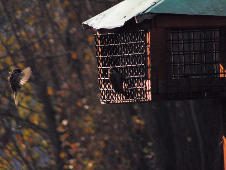 Az etetőre egy egész mezei veréb csapat jár. Gyakran perceket töltenek el bent, s csipegetik az ún. lisztes magvakat (mert ők kevésbé lelkesednek az olajos szotyiért, mint a cinkék).