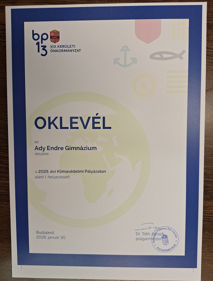 Január 30-án tartották a XIII. kerületi Klímavédelmi pályázat ünnepélyes díjátadóját. Iskolánk pályázatát, mellyel 1. helyezést értünk el, Proksza Ágnes tanárnő nyújtotta be. A tevékenységek a teljes tanévet felölelik, minden hónapra vállaltunk egy-egy akciót.