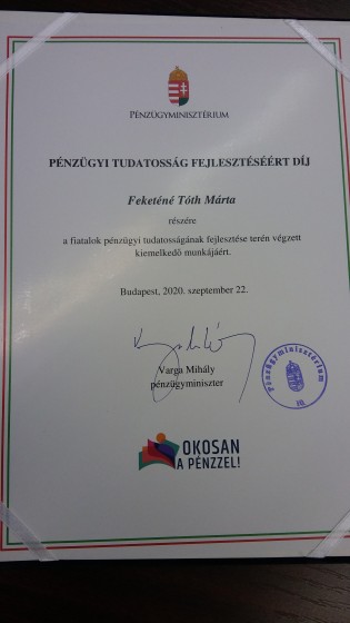 Örömmel értesültünk róla, hogy iskolánk tanára, Feketéné Tóth Márta elnyerte a Pénzügyminisztérium által kiadott Pénzügyi Tudatosság Fejlesztéséért Díjat.