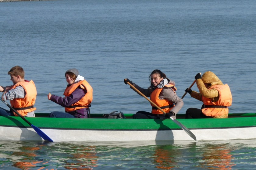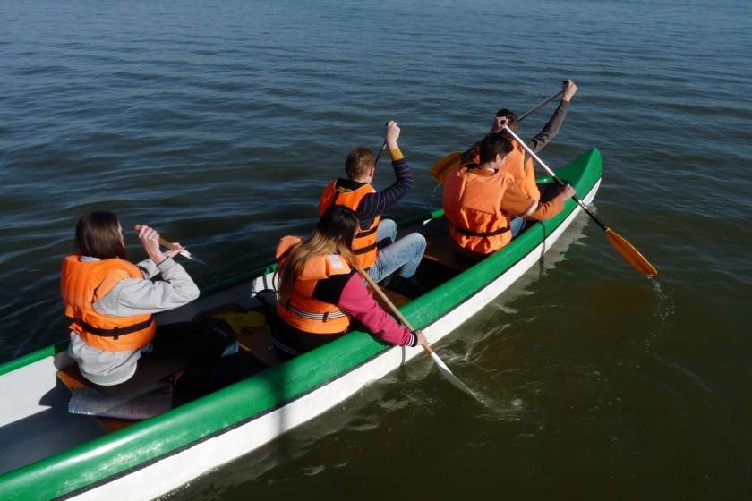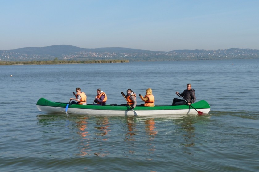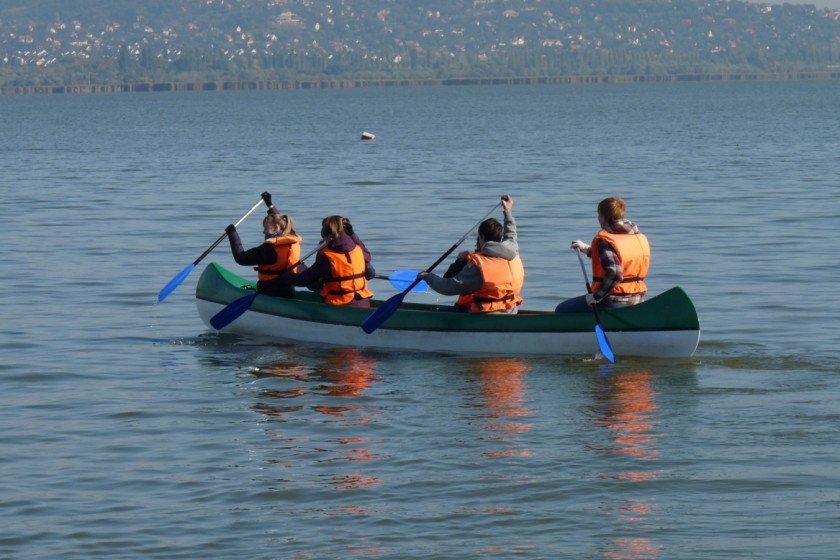 Ezen a kicsit hűvös, de verőfényes őszi napon 14-en vágtunk neki a tónak. Az egyik kenu kormányosa és fővezére Levente volt, aki nagyon vigyázott a rá bízott fiatalabb diákokra. A többi kenuban felnőtt kézben volt a kormánylapát (azaz az evező).